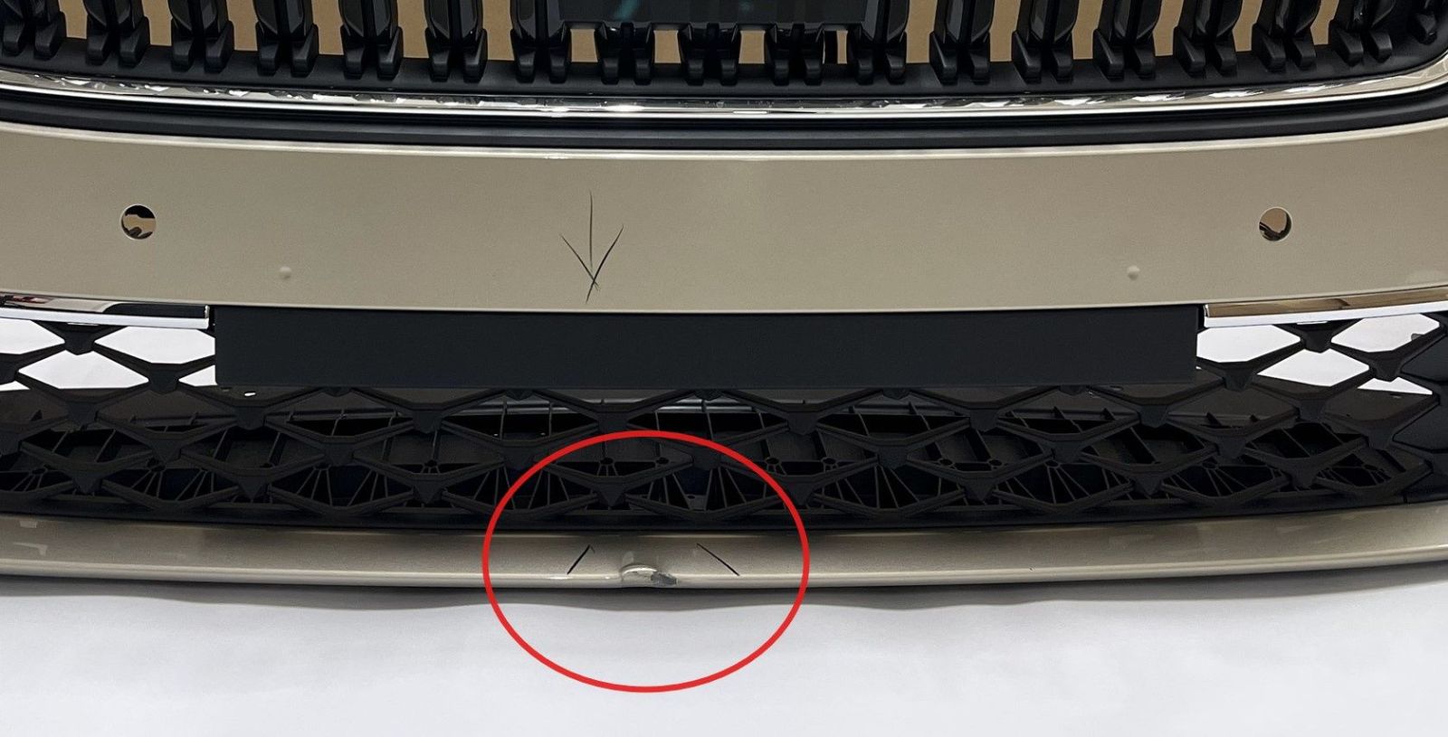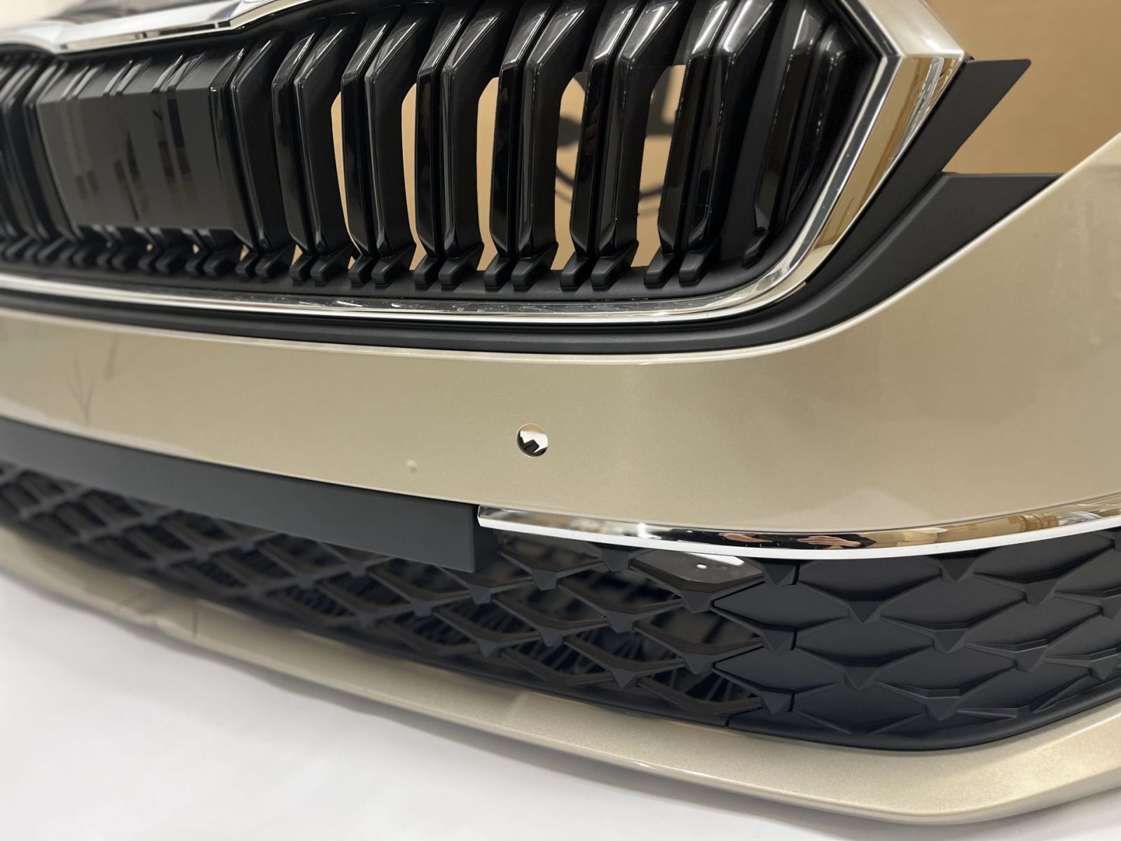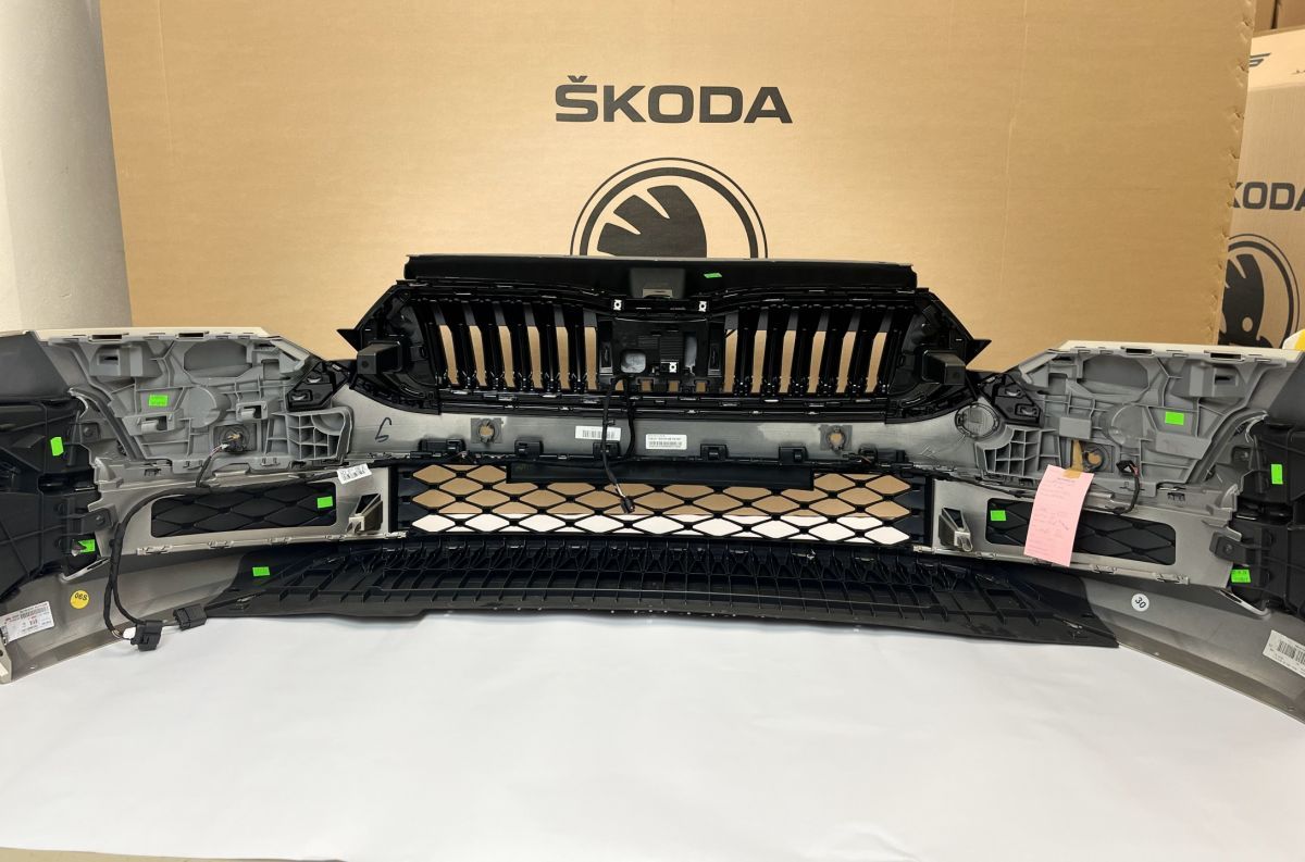 Originální přední nárazník pro Škoda Octavia IV (facelift 2024+) v barvě béžová stříbrná (Sand Gold Metallic). Modernizovaný design s chromovanou maskou chladiče, novým vzorem spodního grilu a decentními chromovanými lištami. Nárazník obsahuje předpřipravené otvory pro parkovací senzory včetně kabeláže, ale samotné senzory nejsou součástí. ✅ Originální přední nárazník pro Škoda Octavia IV (facelift 2024+) ✅ Béžová stříbrná (Sand Gold Metallic) s chromovými prvky ✅ Kompletní sada včetně masky chladiče, chromových lišt ✅ Předpřipravené otvory pro parkovací senzory + kabeláž (bez senzorů) ✅ Spodní mřížky ✅ Kompatibilní s modelem Octavia IV od roku 2024 ✅ Připraven k montáži Spodní část nárazníku má drobné poškození (viz foto), které nemá vliv na funkčnost ani montáž.